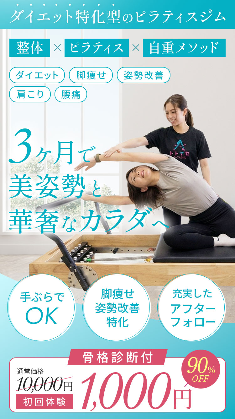 マシンピラティス・パーソナルジム「トトヤセ 十三店」は独自の整体×マシンピラティス×トレーニングで、姿勢や歪みから改善し、トレーニングで持続的な引き締まった筋肉を創りあげます。